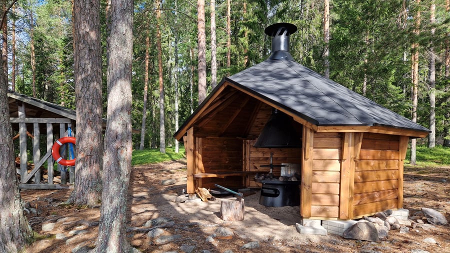 Telkännokan puolikota is a hut on an island (Rehjansaari) in a big lake (Nuasjärvi). You can get wood from a cottage called Kuusela and there WC behind some of the old gray cottages on the island. You can camp free on the island (every persons right in Finland) but the company that manages these huts also rents out cabins, kayaks, SUP boards, and other services in the area: https://luonnollisesti.fi/