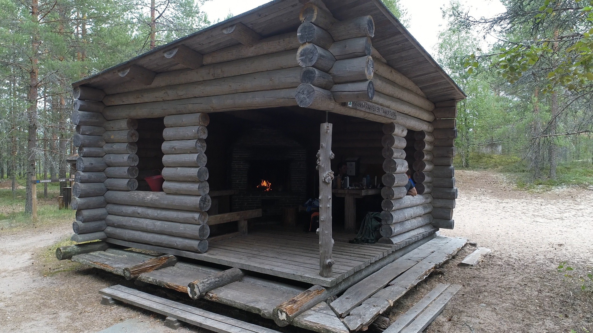 An open campfire hut on Lake Kaaresjärvi & Oulujärvi with a traditional brick fireplace.