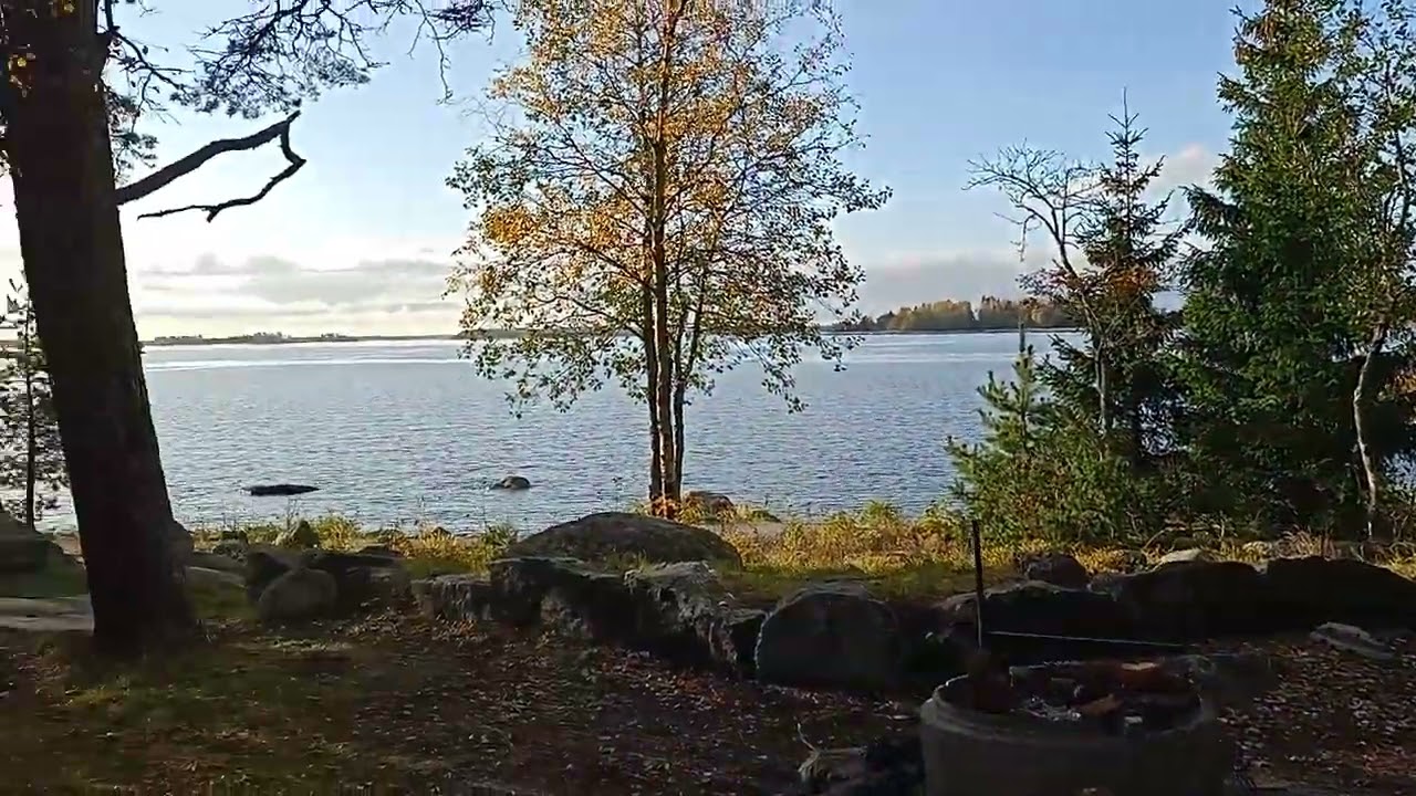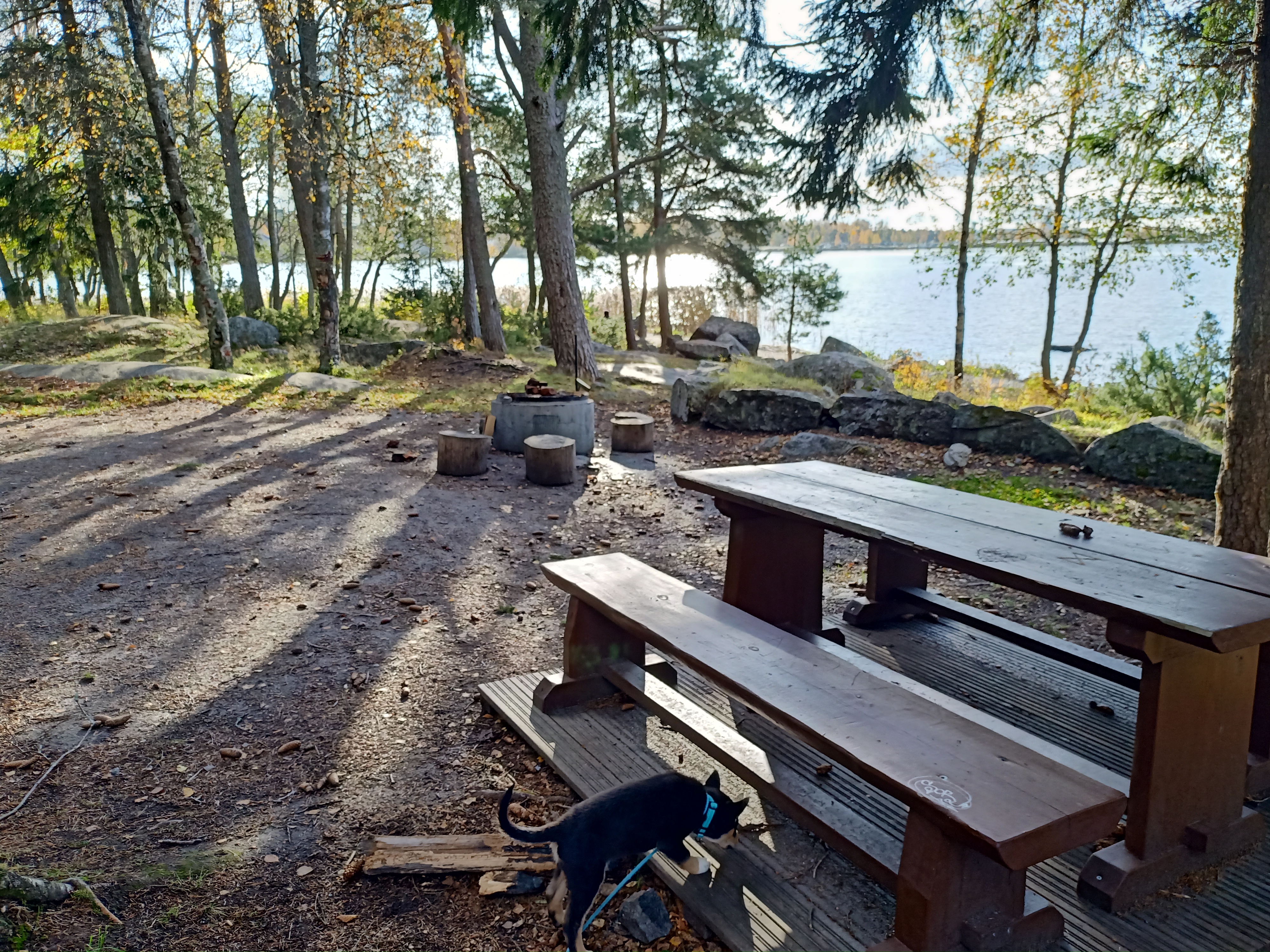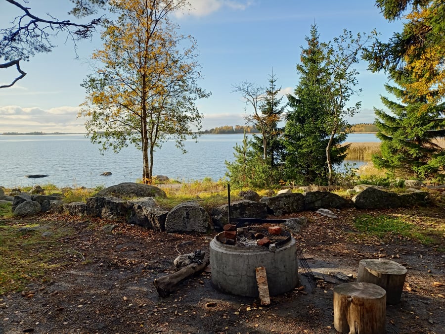 An outdoor grill on a small island called Variskarit. It has a small walking path around the island.