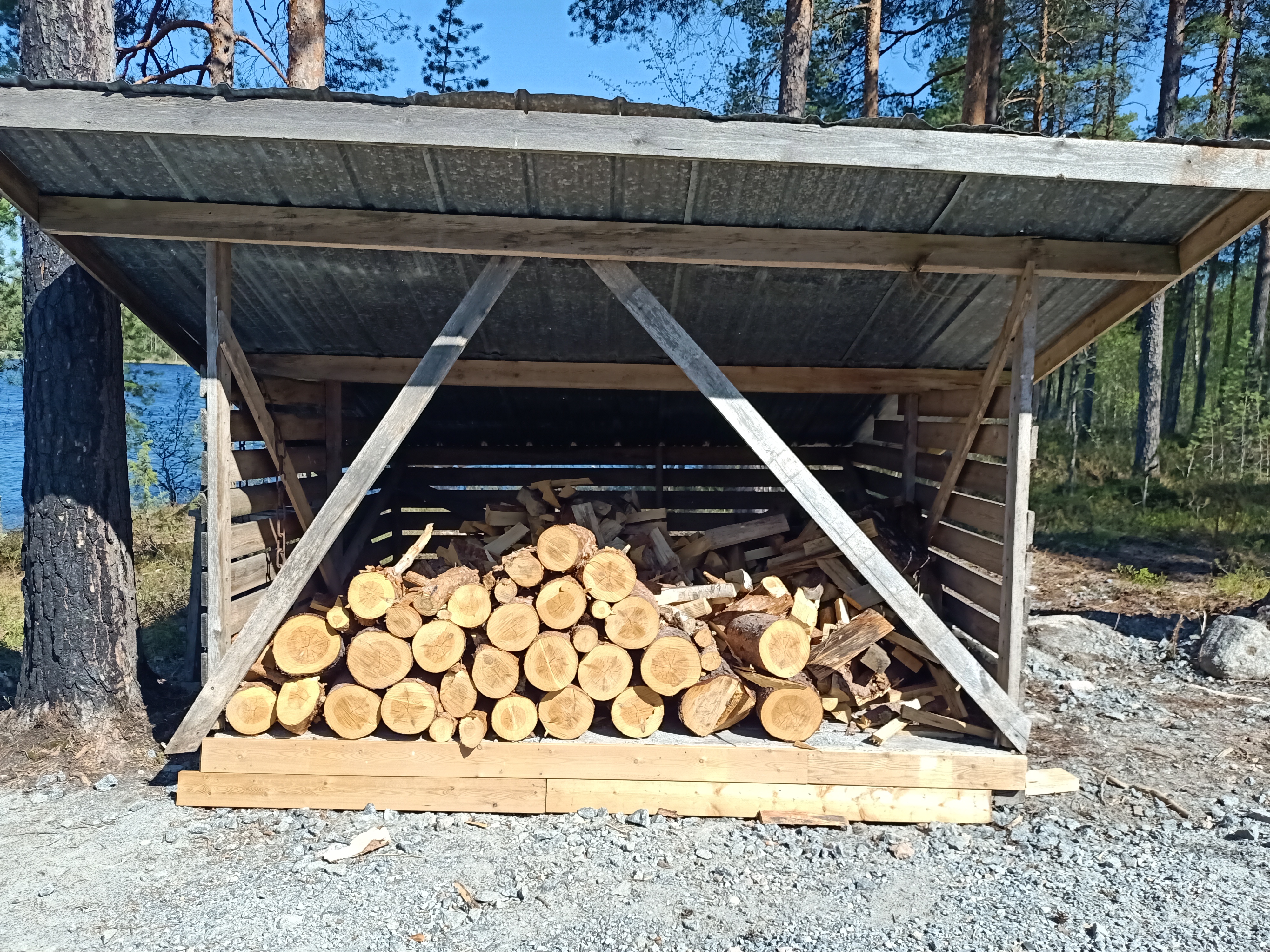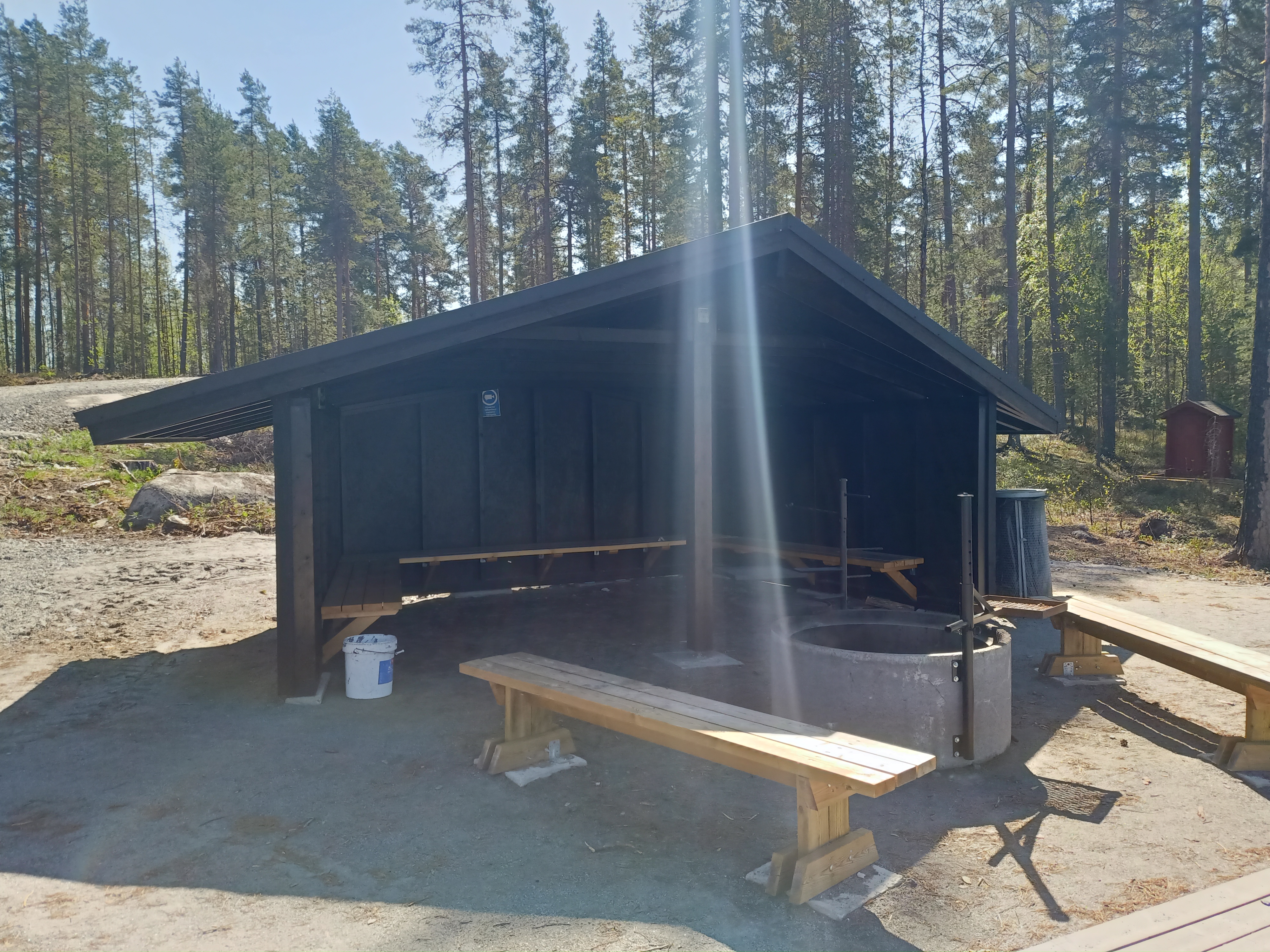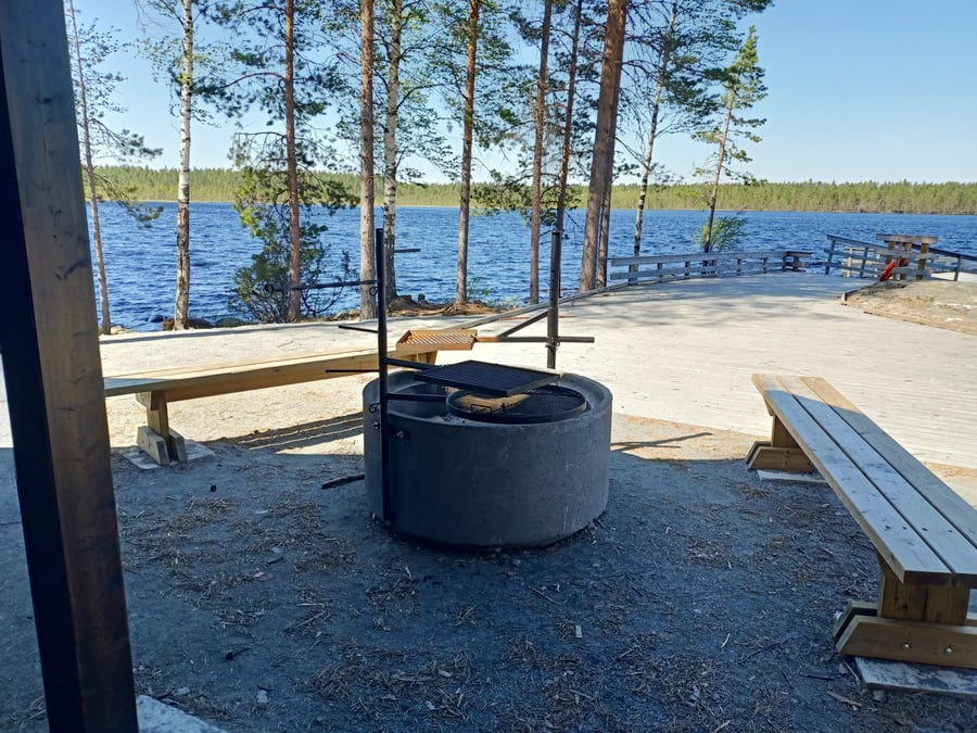 A really nice new open hut / laavu overlooking the lake (Saarijärvi). There is an outdoor grill and wood near by. Perfect place to rest on a road trip.