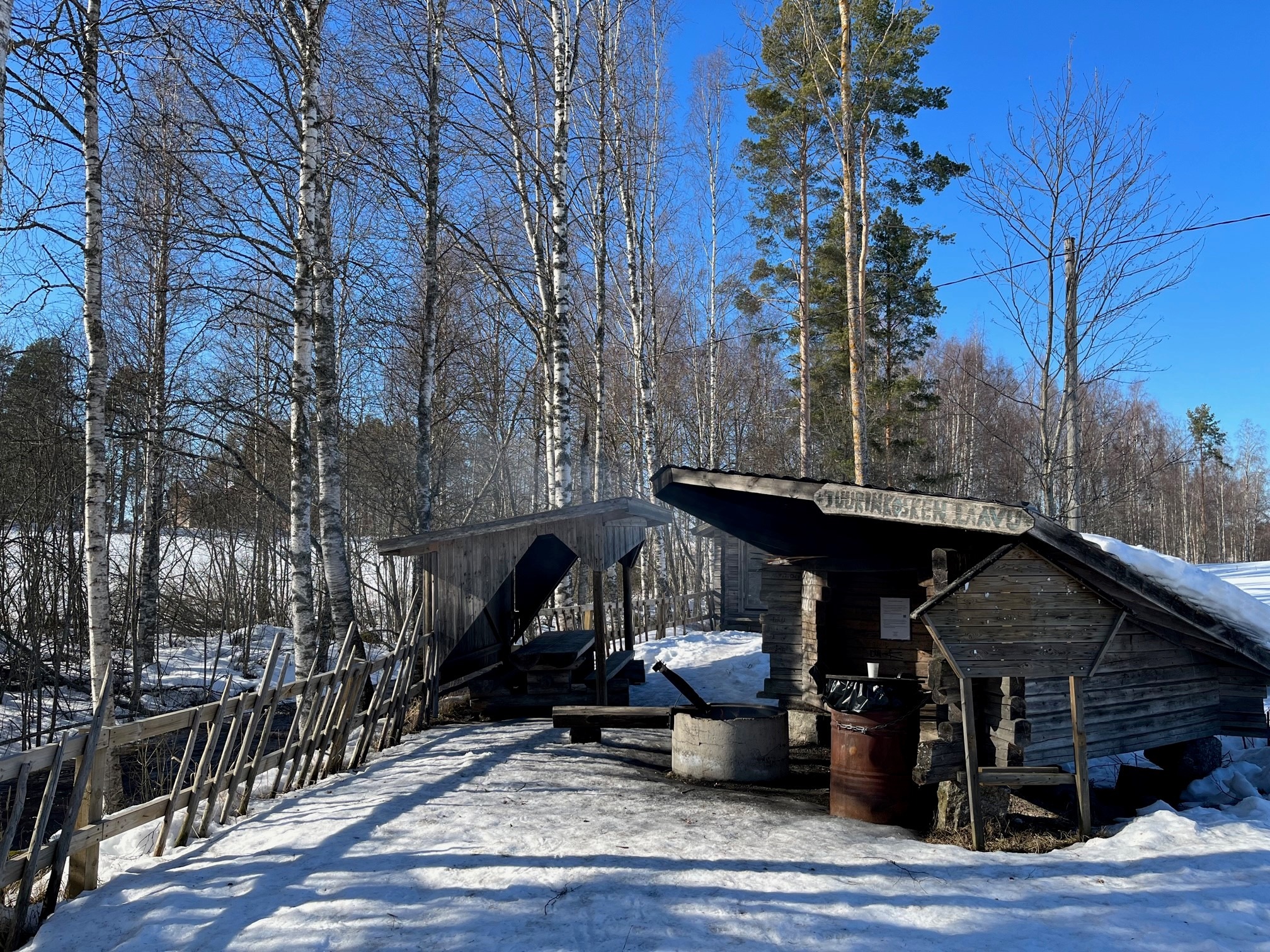 The Tuurinkoski laavu, situated by the Töysänjoki River in Alavus, is a favored rest stop, particularly for skiers in Tuuri. It is conveniently accessible by car via a quiet dirt road, with a ski trail connecting it to the Kirkkovuori route. The laavu area includes a wooden shed.