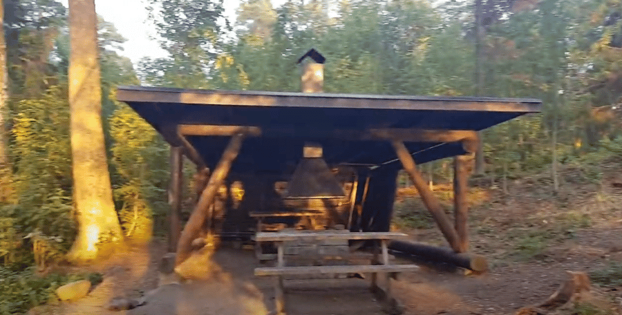 An outdoor grill & hut which is designed to cook food. There is a bathroom on the island. It is a great place. to kayak out to.