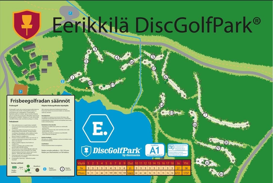 18-reikäinen A1-tason frisbeegolfrata.