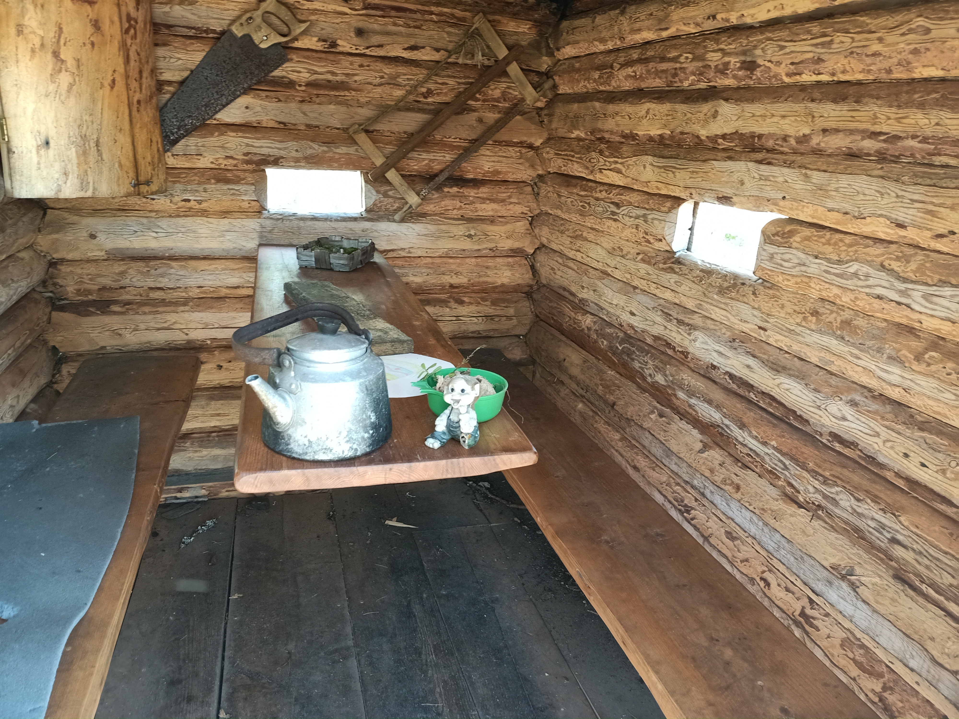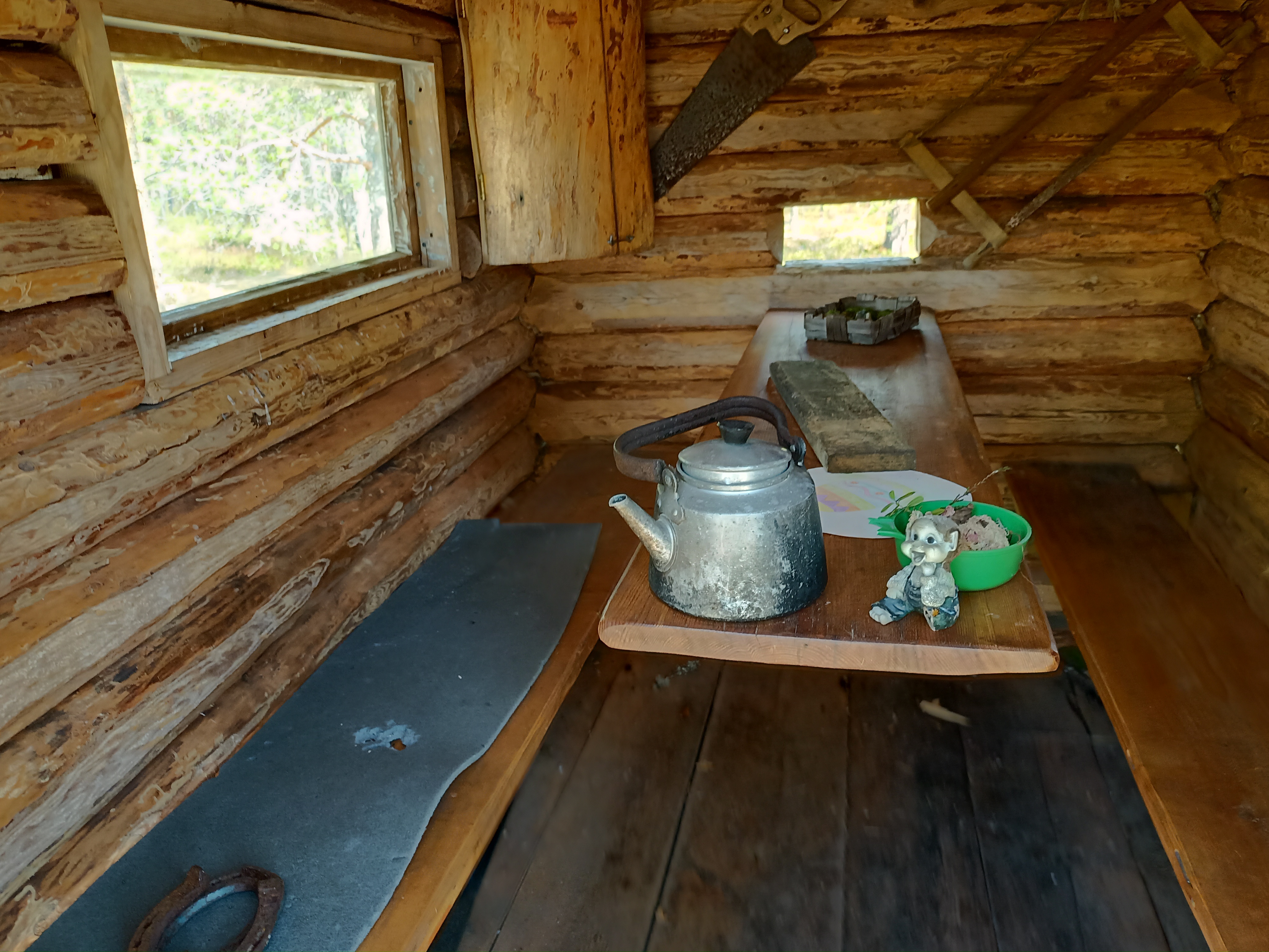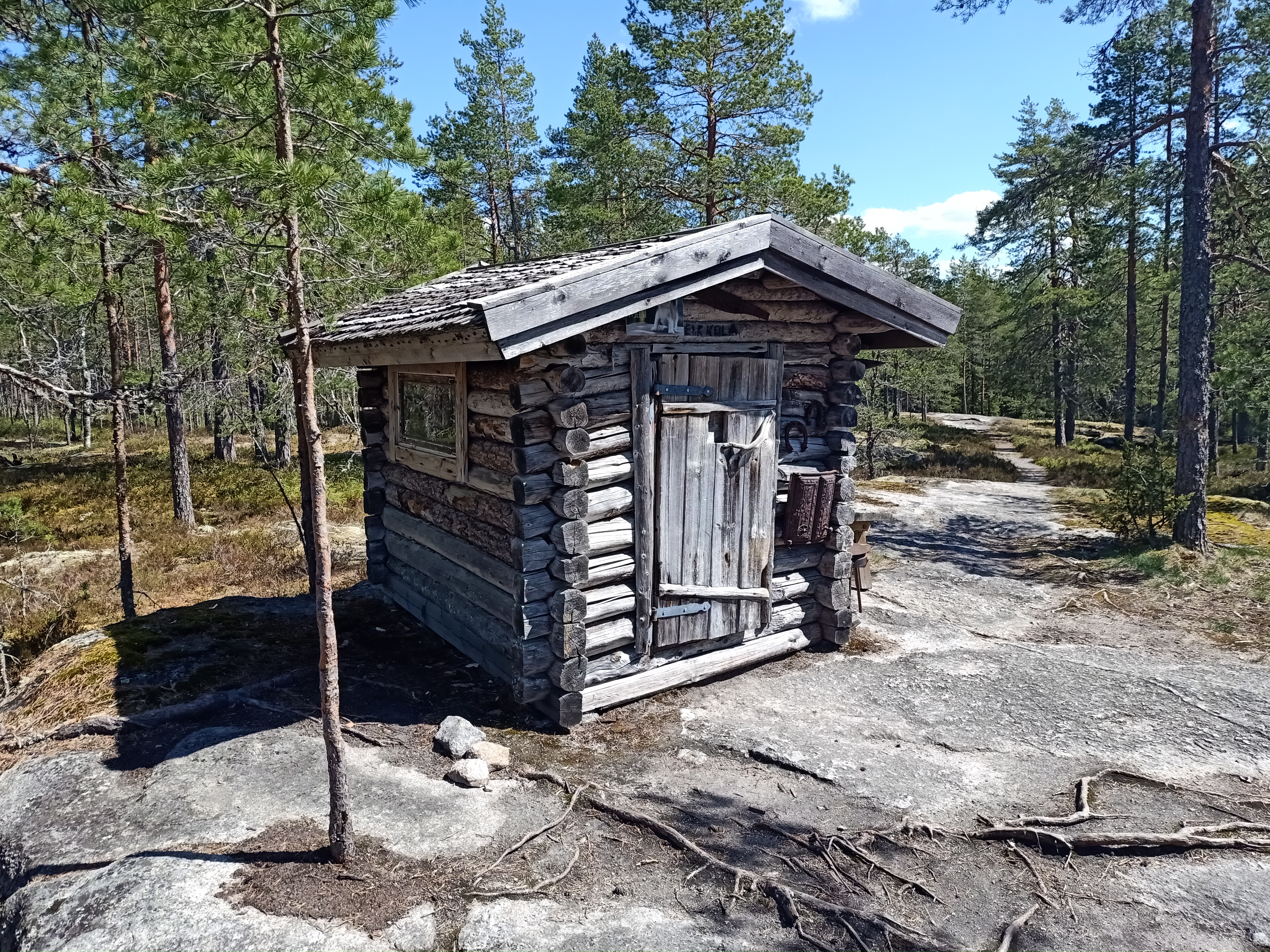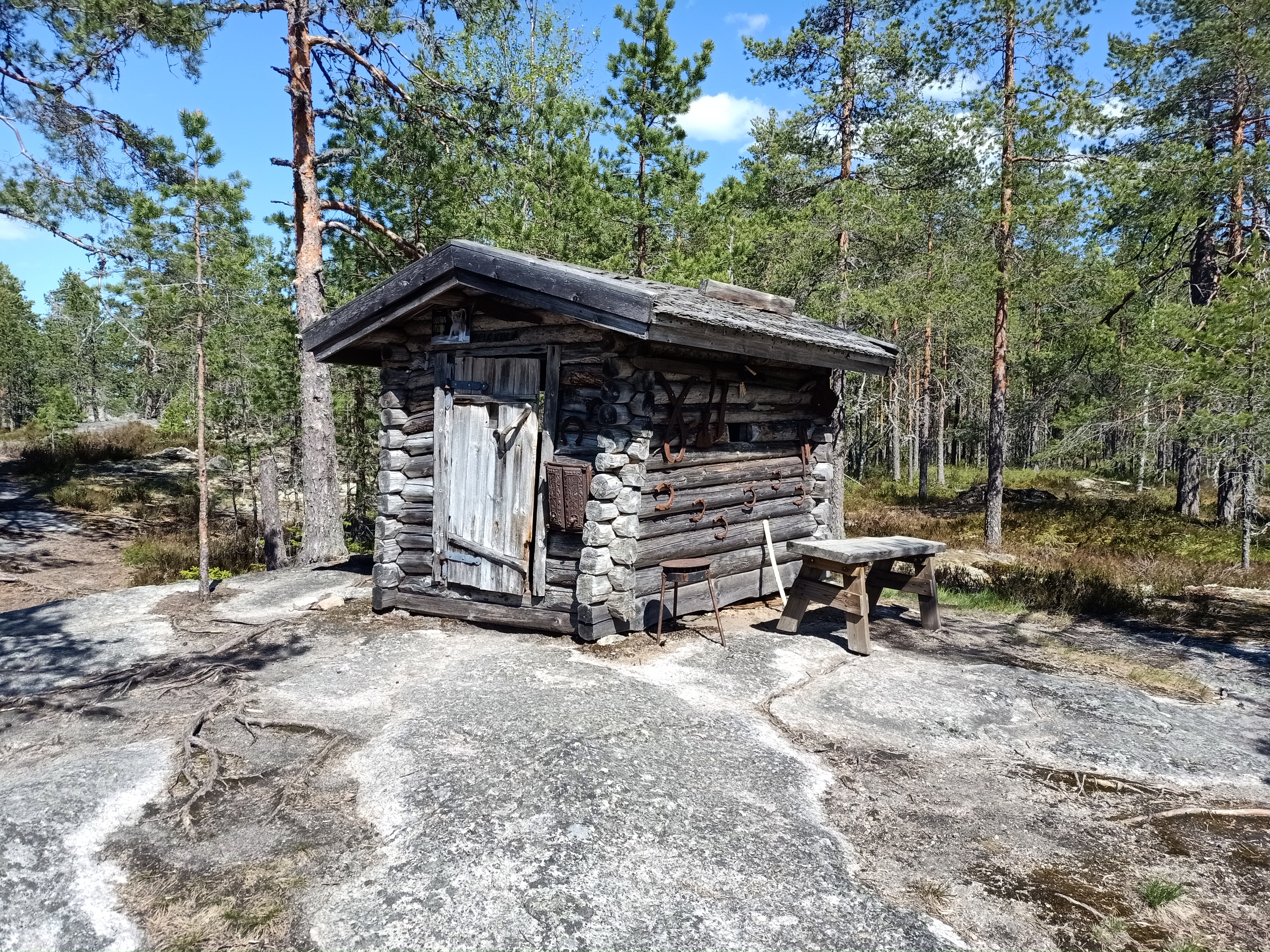 Täällä on pieni vanha mökki ja nuotiopaikka, jota retkeilijät voivat käyttää.