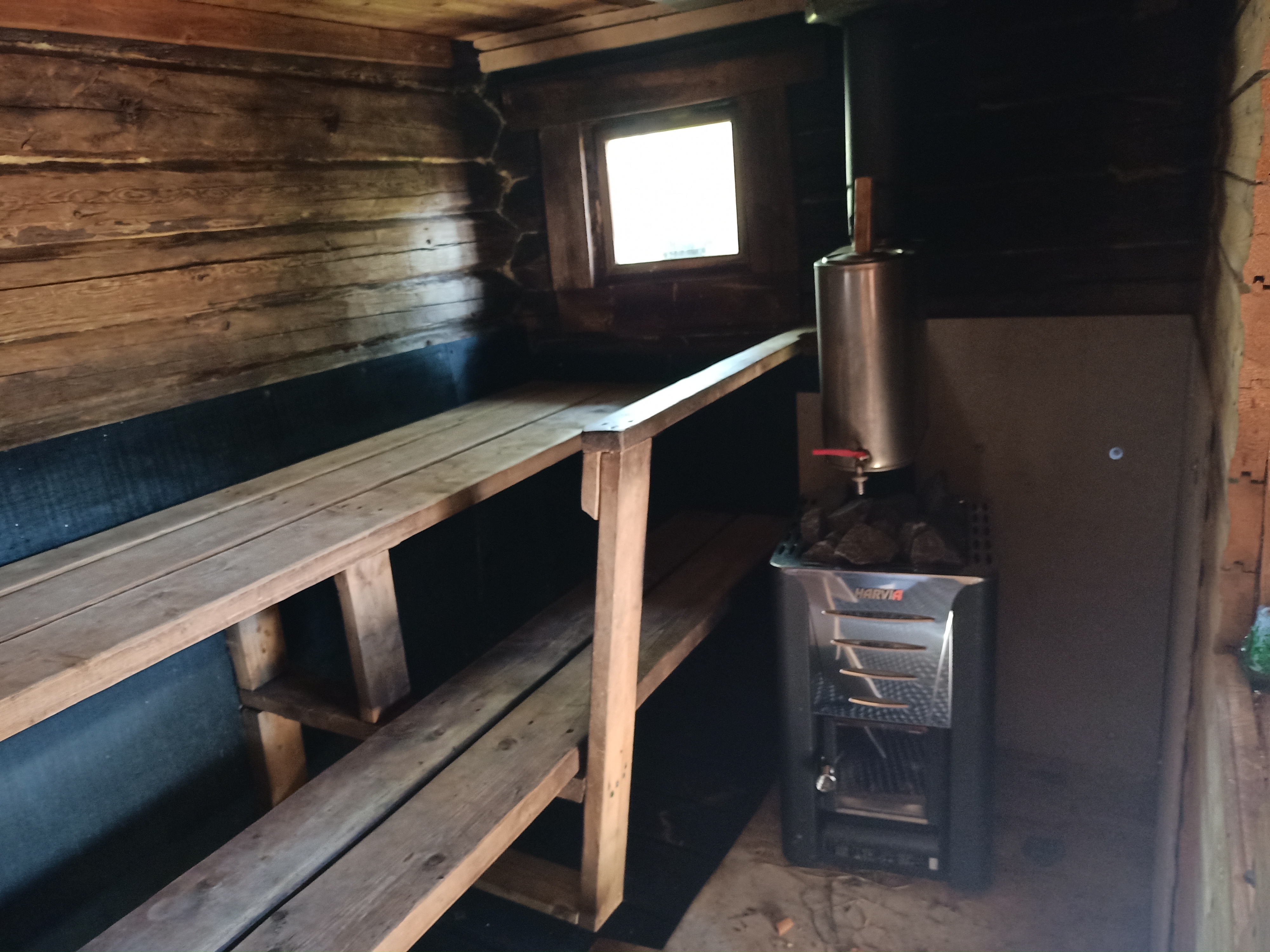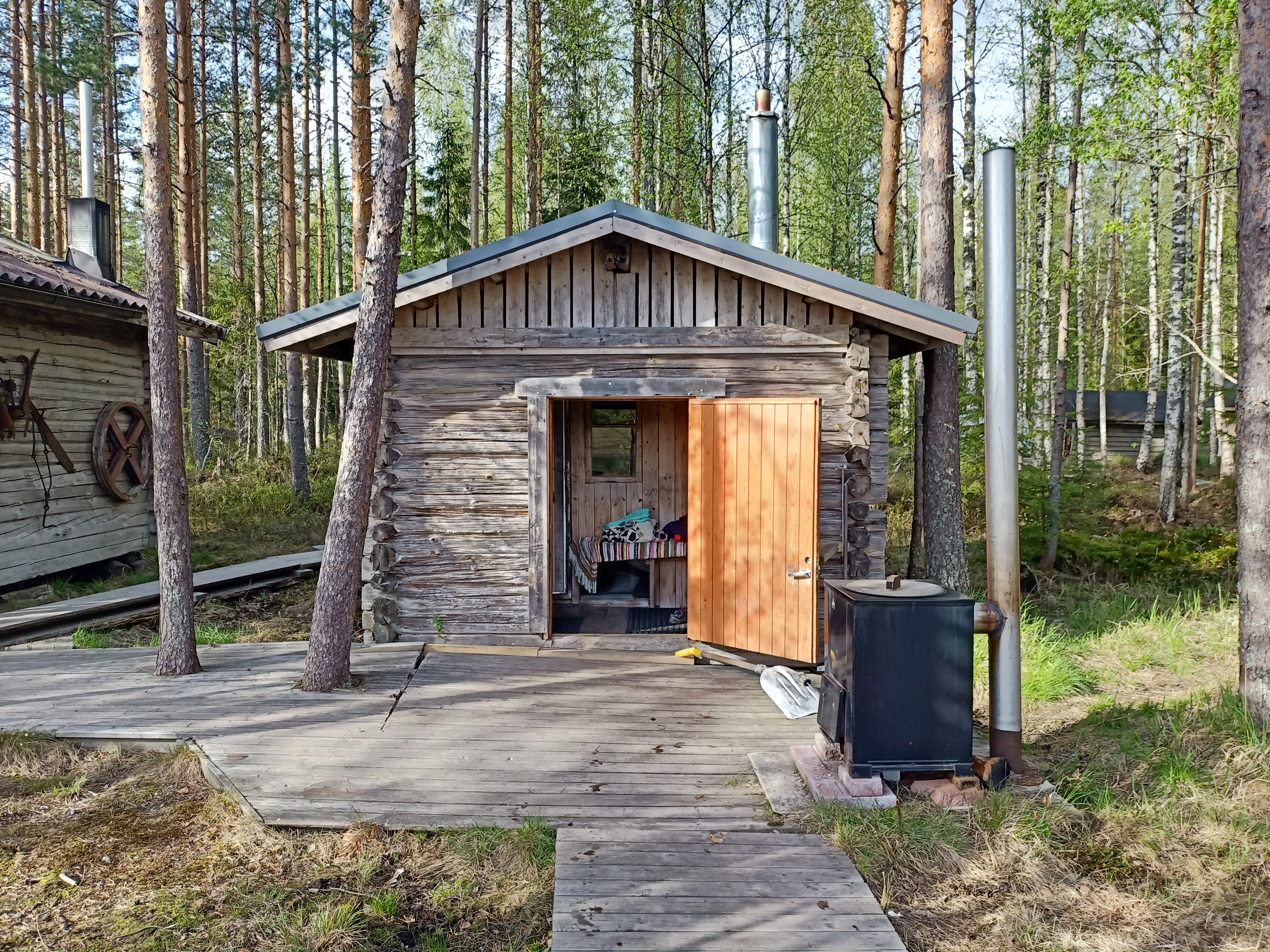 Mökkiä vastapäätä sijaitseva sauna, jonka voi vuokrata