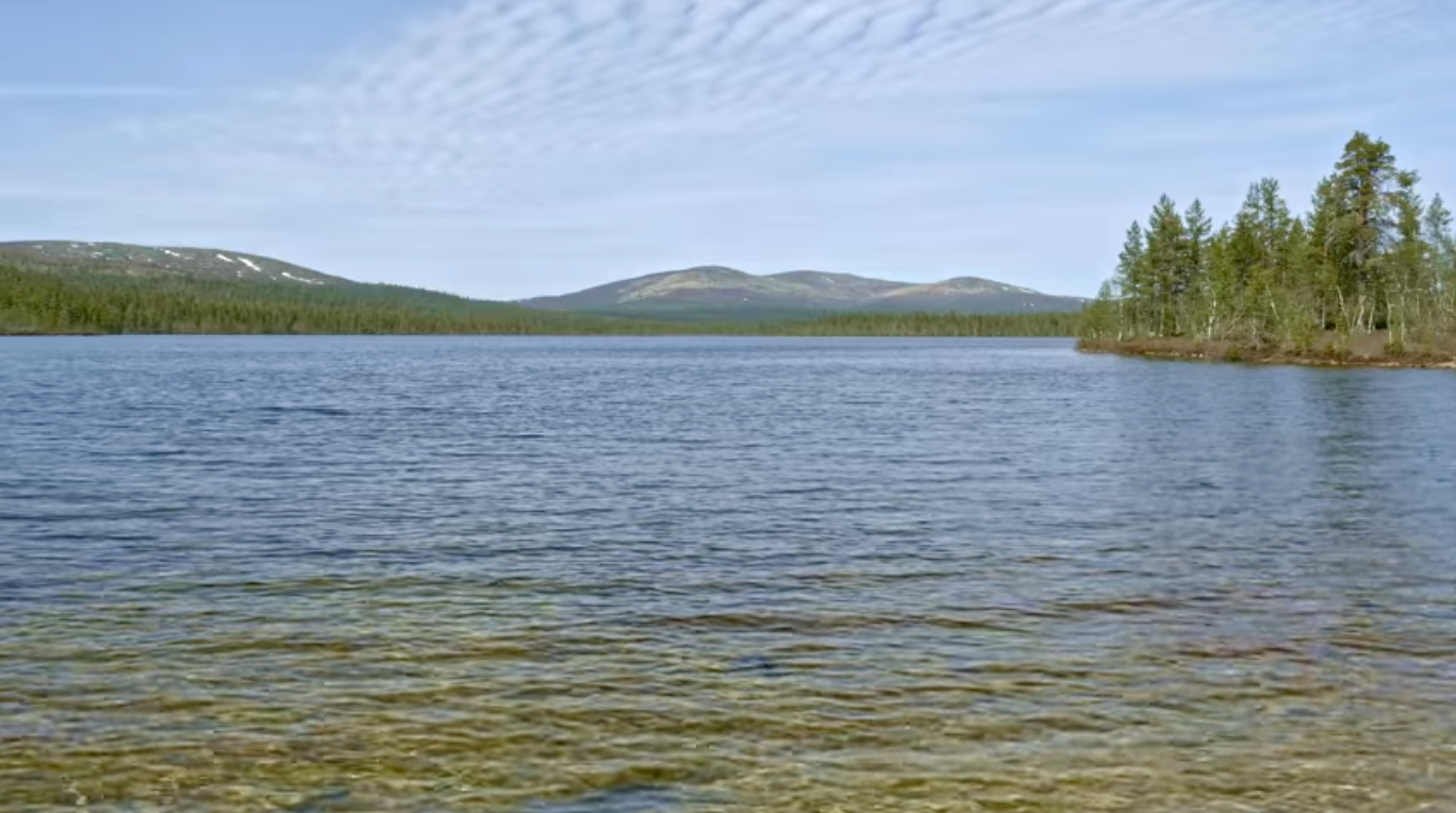 Leirinuotiopaikka Luiojärven mökin vieressä, josta avautuu näkymä Luiojärven kristallinkirkkaisiin vesiin ja taustalla kohoaviin kukkuloihin.